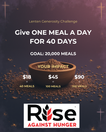 This Lent, Hickory is partnering with Rise Against Hunger to help provide nutritious meals to communities facing food insecurity around the world. Rise Against Hunger works through local partners to distribute meals that support education, health, and resilience in some of the most vulnerable places on earth. Together with our partners at Hickory Elementary School, we are working toward a shared goal of 20,000 meals, and thanks to your generosity, we have already raised $1,900 and counting. At just 45 cents per meal, every dollar makes a real and immediate difference. As we journey through Lent, we invite you to turn small daily sacrifices into life-giving hope for others.